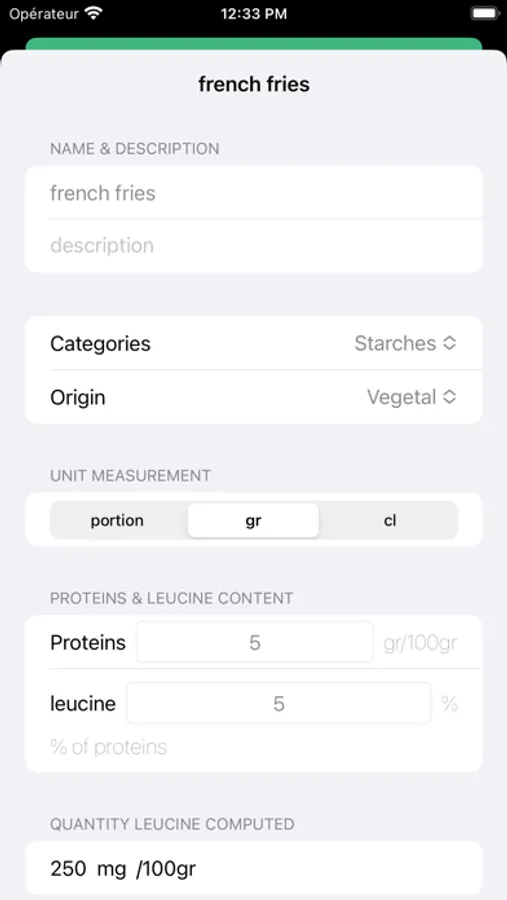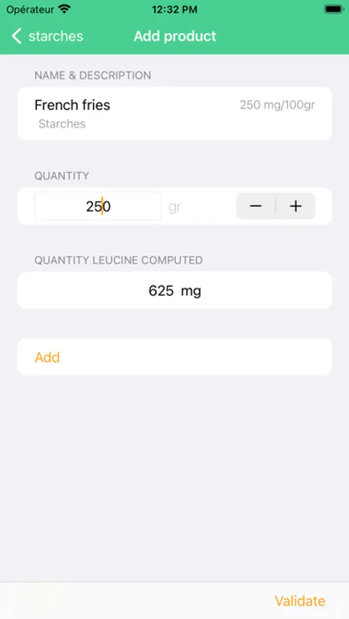 - Leucine intake calculation : The app calculates the amount of leucine in each meal based on the chosen foods and their quantity, allowing the user to ensure they adhere to their strict diet.