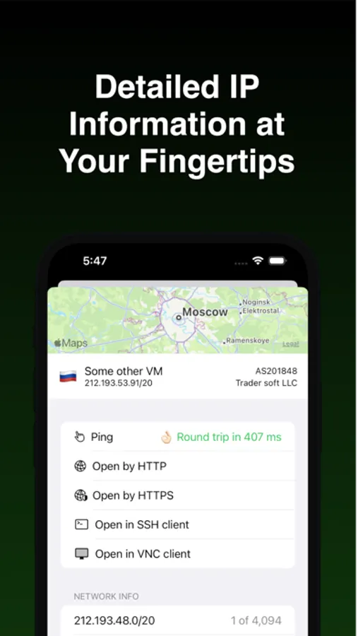 Octets also includes a built-in Ping functionality, allowing you to quickly check the availability and responsiveness of your IP addresses with just a tap. This helps you troubleshoot network issues and ensure the smooth operation of your network connections.