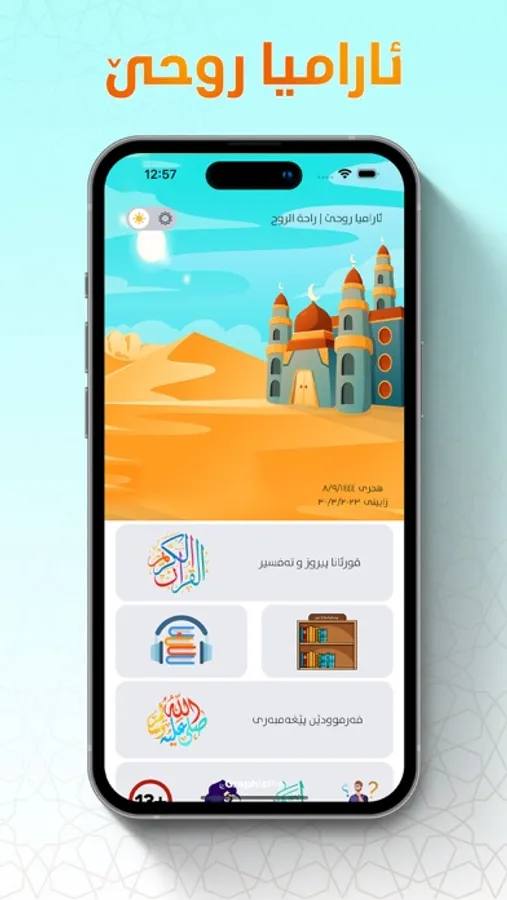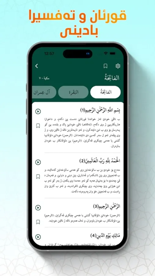 ئێك: بەشێ قورئانا پيروز و تەفسيرێ، كو تو دشێی ل ڤى بەشى قورئانا پيروز و تەفسيرێ ب خينى، و ل ديڤ ئارەزويا خو قەبارێ فونتێ قورئانێ و تەفسيرێ ب گوهرى. هەروەسا تو دشێی گوهداريا قورئانێ بكەى ئەڤە ژى ژ بو وان كەسێن خاندنا وان لاواز دێ مفاى ژێ بينن.