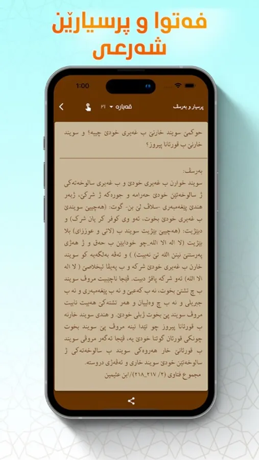 شەش: فەتوايێن شەرعى : ل ڤى بەشى نيزيكێ 500 فەتوا و پرسيارێن شەرعى يێن تێدا هەين دەربارەى بابەتێن جوراوجور، كو يێن هاتينە بەرسڤ دان ژلايێن زانايێن مەزن ڤە و يێن هاتينە وەرگێران بو زمانێ كوردى.