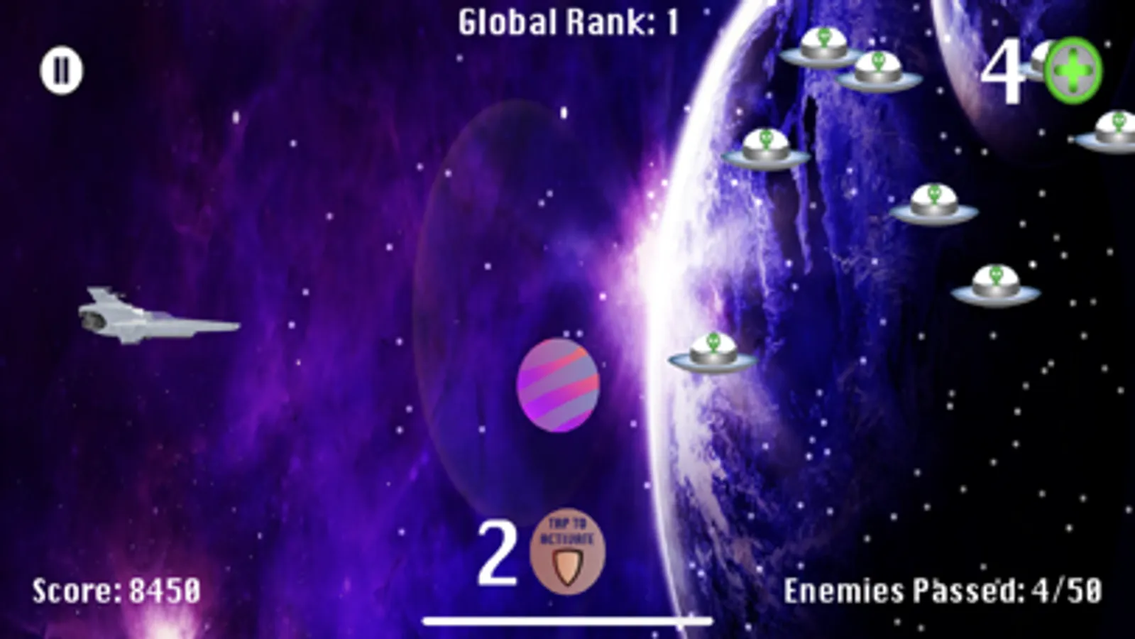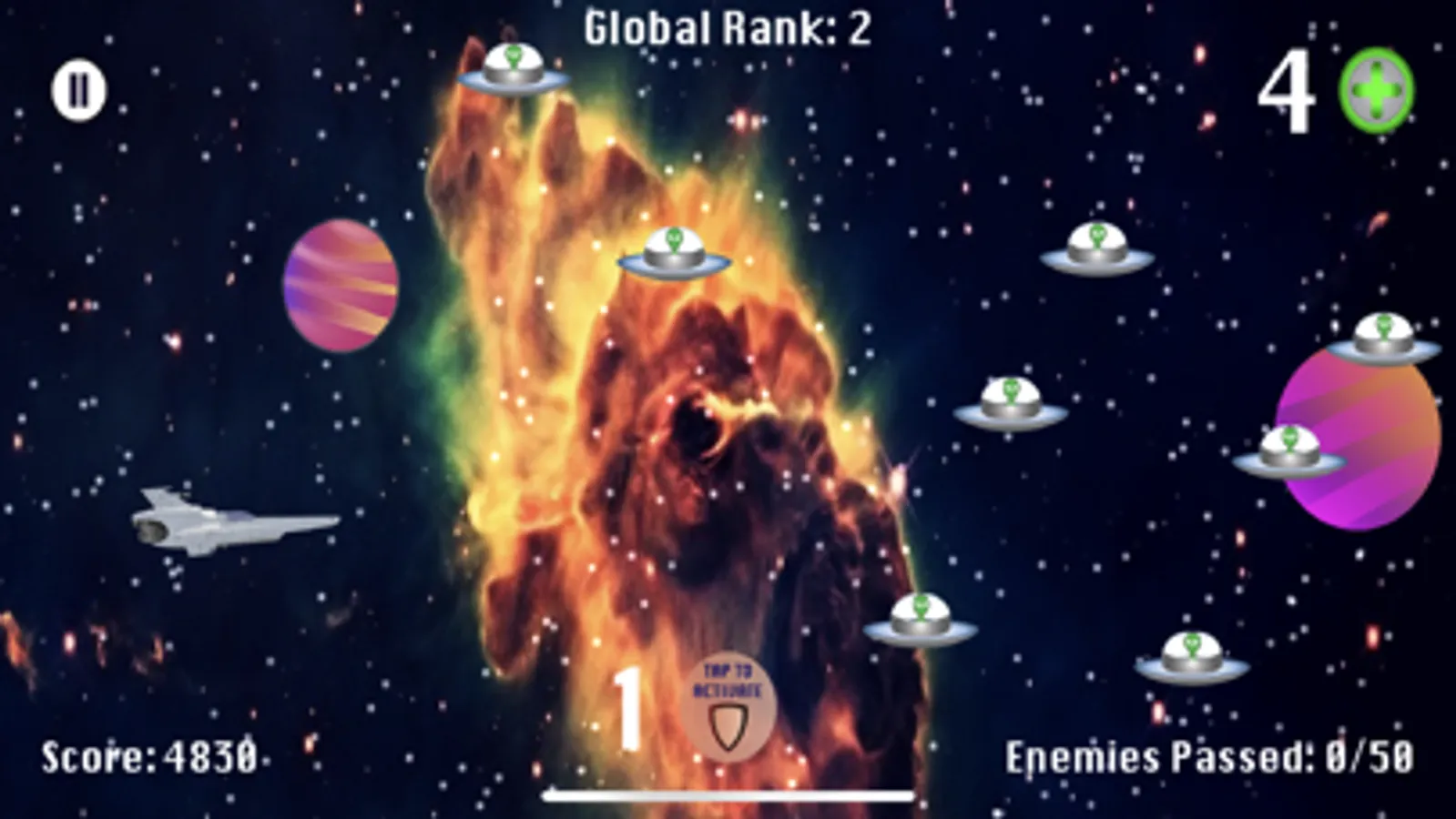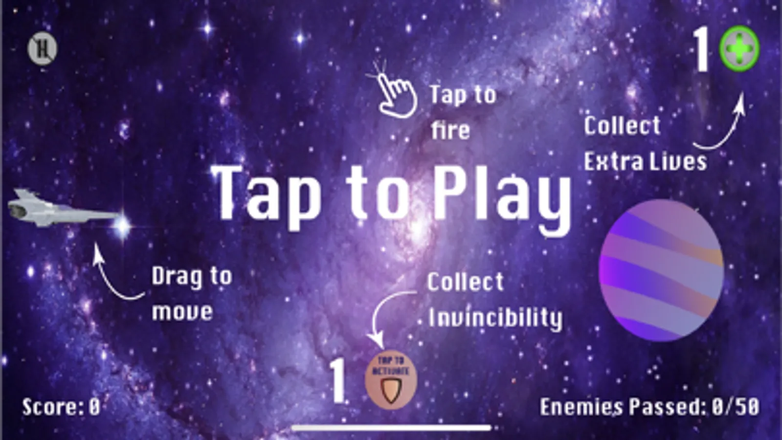 Battle your way through waves of incoming aliens as you try to shoot them down while not crashing. Beware, as you advance through the phases they become more aggressive, and you'll need to be quick to survive. Don't let too many aliens pass or they will destroy the galaxy and it's game over. Make sure to collect extra lives and invincibility along the way- you're sure to need it. Make sure to save your invincibility for when you really need it! They don't come around often, and will protect you in critical moments, giving you a chance you catch your breath and get back into the fight. Good Luck!
