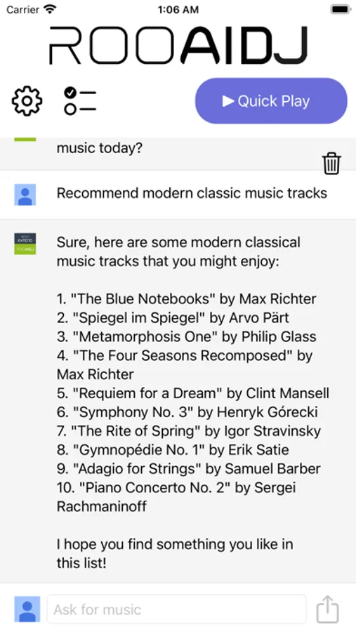 So if you're ready to take your music listening experience to the next level, it's time to give rooAIDJ a try. With its intuitive chat-based interface, smart recommendation engine, and DJ capabilities, rooAIDJ has everything you need to become the ultimate music curator. What are you waiting for? Start chatting with rooAIDJ today!