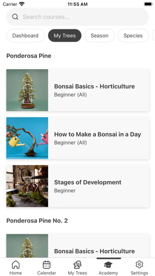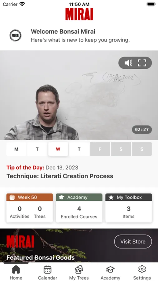 - Academy provides a library of courses that help you build your knowledge and understand “why” you perform each calendar activity for your trees. With recommended courses based on season, technique, species, and trees in your collection, Mirai Mobile’s Academy is an endless wealth of bonsai knowledge. Complete with a syllabus that details what to expect and how long it will take to complete; we’ve brought an academic approach to your fingertips that demystifies bonsai. At the end of each course, test your knowledge with a course evaluation to ensure you can apply the knowledge you learned to your bonsai practice.