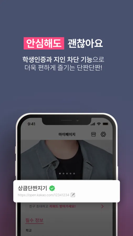 · 검증되지 않아 섣불리 하기 어려웠던 프로필 정보를 단짠단짠의 캠퍼스 인증 시스템으로 믿을 수 있는 프로필로 제공해드려요. (매칭에 참여되는 모든 회원 100% 재학생)