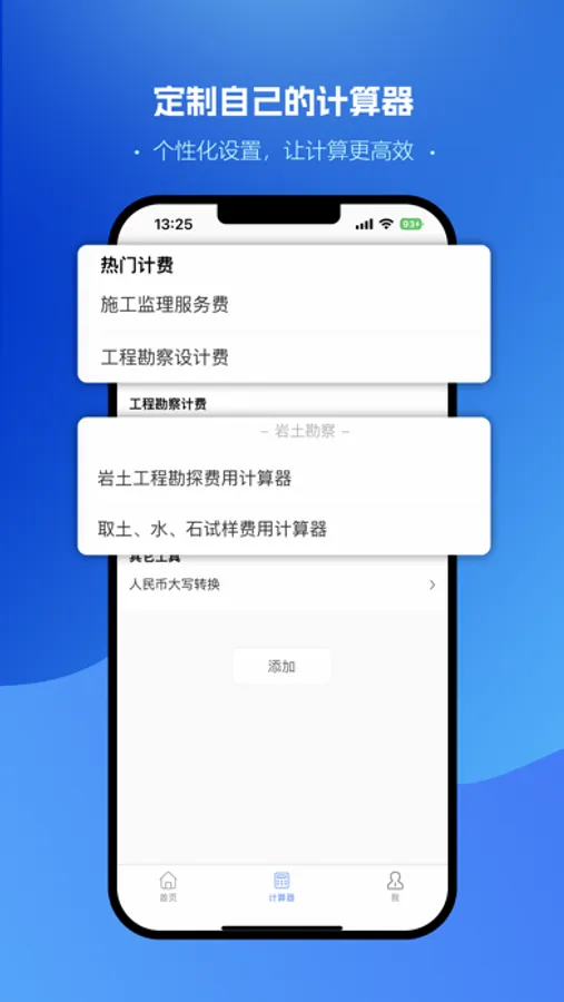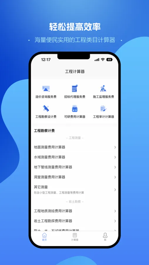 “工程计算器”包含了众多实用的计算器工具,帮助你轻松解决各种费用的计算问题。我们提供了工程勘察、勘察计费、岩土勘探、地面测量、水域测量、地下管线测量、洞室测量、造价咨询服务费、招标代理服务费、施工监理服务费、工程设计收费和可研收费等众多计算器工具,让你的工作更加简单。