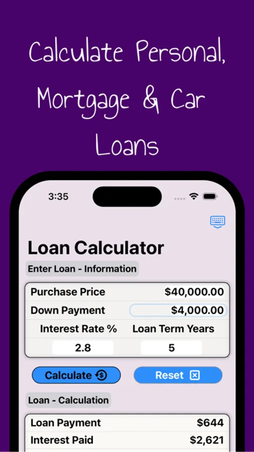 With just a few simple inputs, our app will provide you with comprehensive calculations, including payment, total interest paid and grand total amount of your purchase, so you can plan your finances with ease. With our Apple Smart Loan Calculator app, you can quickly compare different loan options and find the one that's right for you.