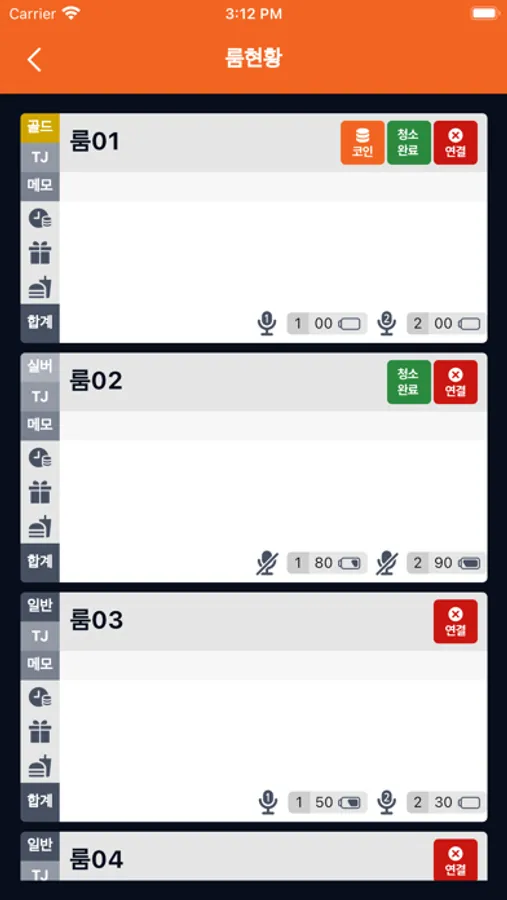 가. 룸 현황 조회 : 입실 상태, 잔여 시간/코인 수량, 결제 상태, 서비스 내역 등 해당 룸에 대한 다양한 정보를 확인할 수 있습니다.