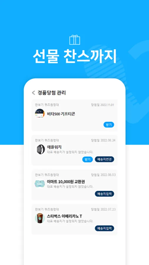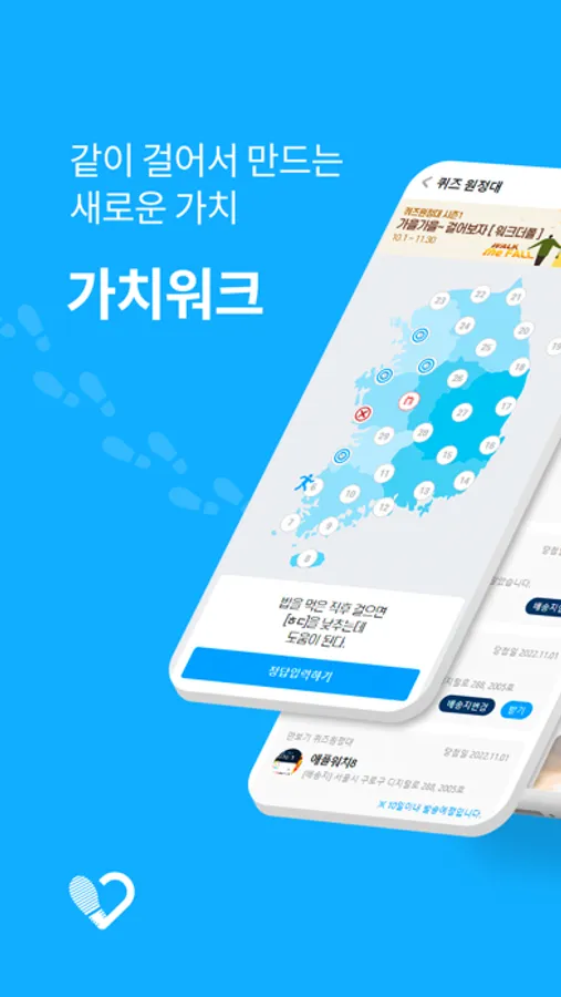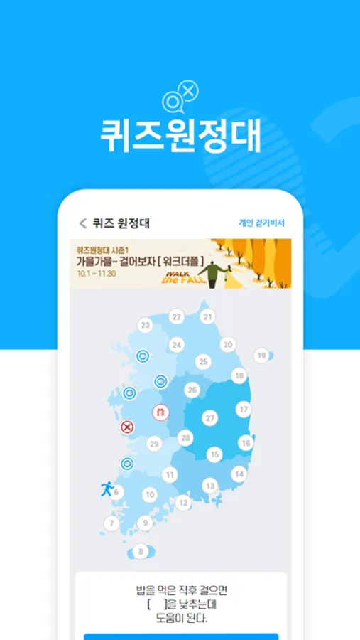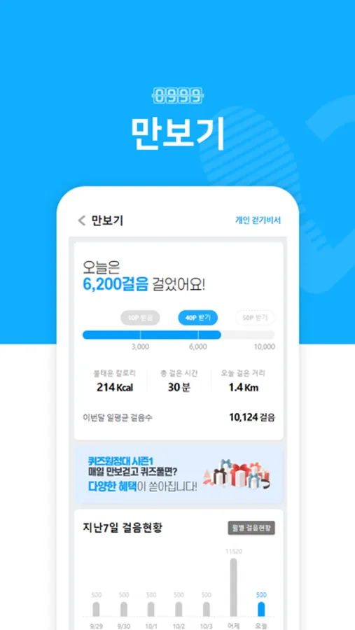 • 만보기 기능은 기본. 10,000 걸음을 달성하면 100포인트 지급, 100% 경품 당첨이 되는 퀴즈도 풀 수 있어요.