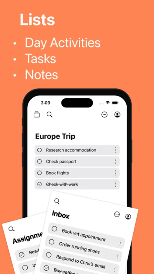 - Lists: Lists are available for tasks and projects. You can easily shift any item from a list into your daily schedule.