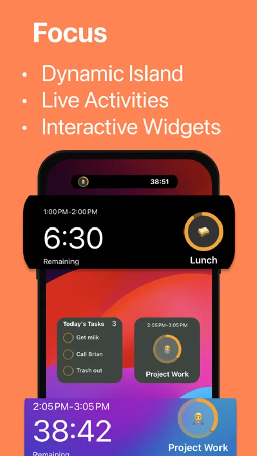 - Distraction-Free: Zero in on your current activity with focus mode and a distraction-free user interface. Your current activity is showcased as a Live Activity, viewable on the Dynamic Island and Lock Screen.