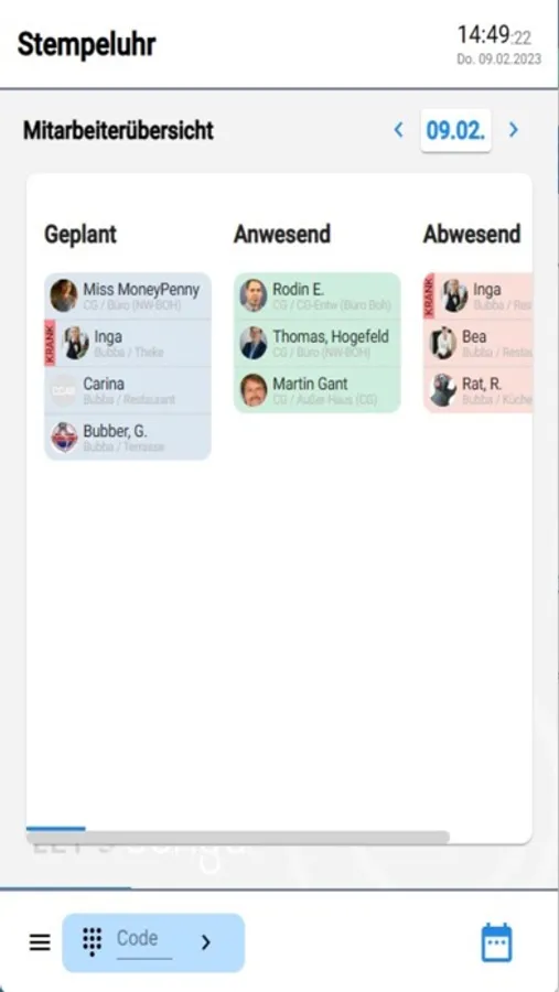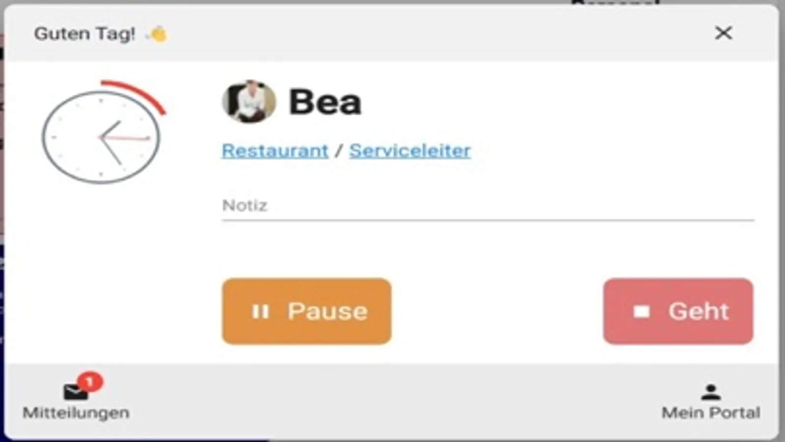 Für alle Mitarbeiter sichtbar und doch persönlich Im Personalraum (mehrere Monitore je Betrieb möglich) oder auch auf der Kasse Stempelfunktionen Mitarbeiter kommt, geht, hat Pause Runden und Plananpassungen optional möglich automatischer Abzug von Pausenzeiten Anmeldung Per Code, Transponder, Kellnerschlüssel oder per Fingerprint