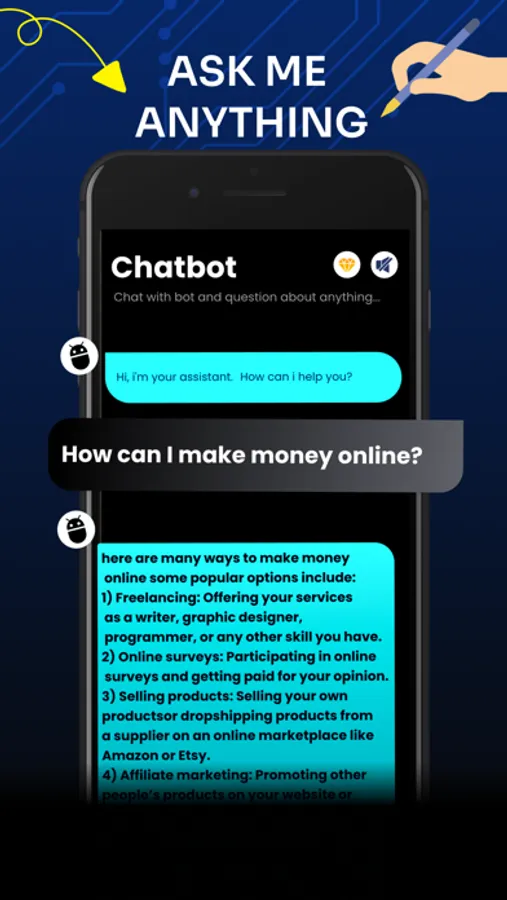 AI Chat Bot app writer Powered by GPT-4! Ask Al assistant to write anything. Get instant and smart answers with AI Chat!