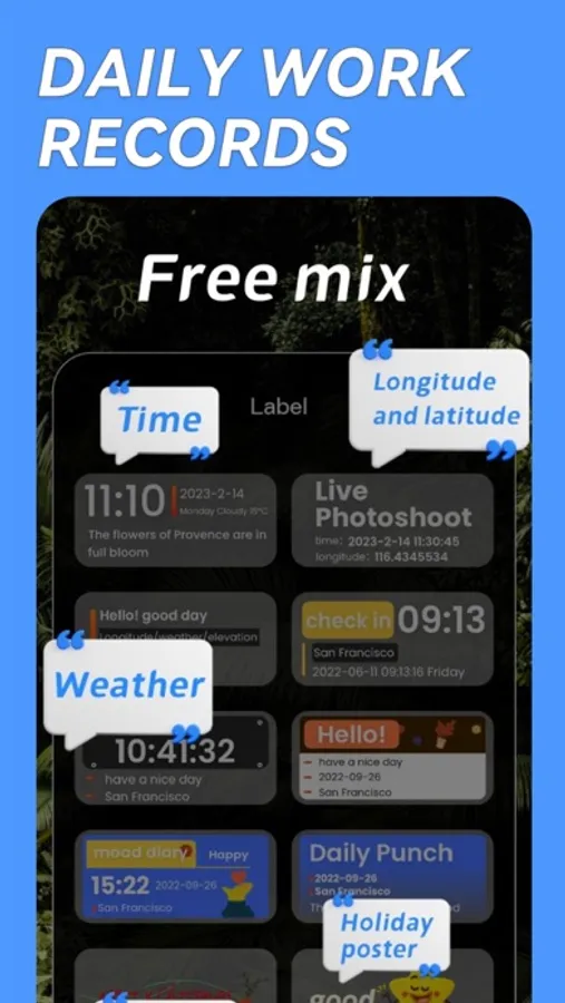 Multiple characteristic watermarks such as work, time, location, latitude and longitude, altitude, weather, mood, diary, and features