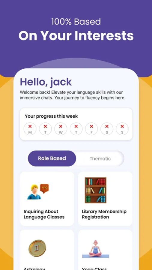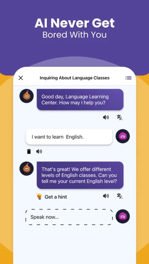 • Personalized conversations tailored to your speaking level, focusing on topics relevant to your life.