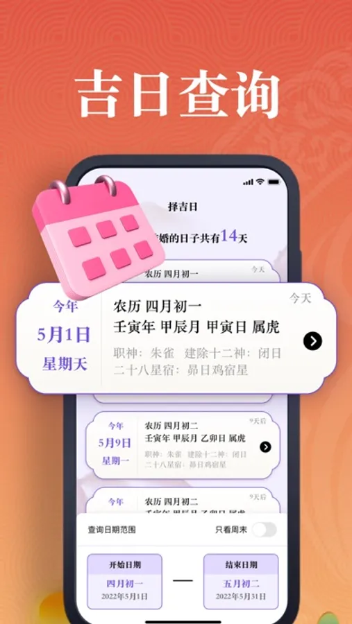 精准日历、专业黄历、吉日查询,澈影万年历工具是您的掌上日历管家!节假日、节气、黄道吉日吉时、农历换算等等均可轻松查询,日期信息一目了然。