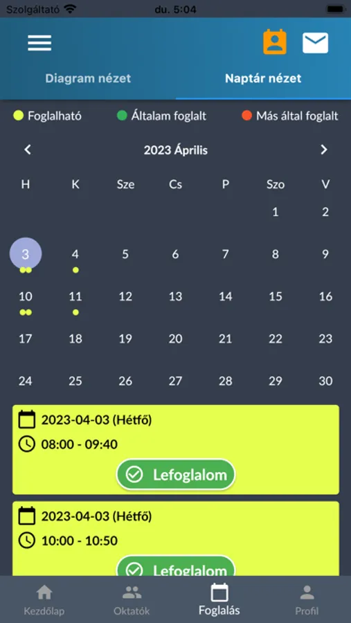 bejelentkezés után a tanuló látja az oktatójának a foglalható időpontjait. Foglalhat vezetési időpontot, amiről megerősítő emailt kap.