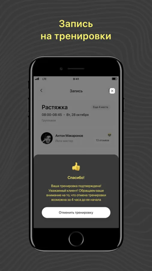 Получать PUSH-уведомления о предстоящей тренировке за 3 часа;
