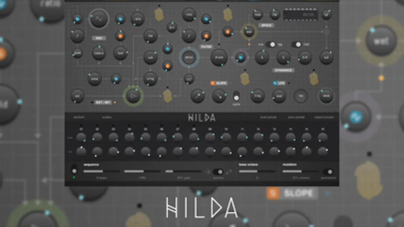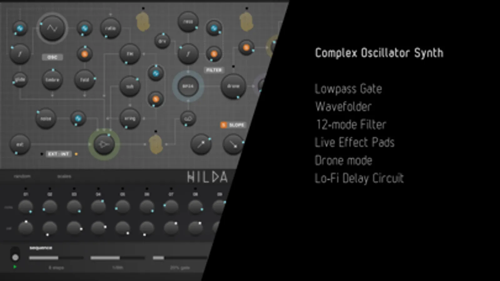 Hilda is a Complex Oscillator Synth, inspired by the most interesting aspects of both west-coast and east-coast synthesis techniques. You'll find a wave folder, lowpass gate, and audio-rate modulations, but also a 12-mode filter and traditional VCA circuit. All parts of the instrument are carefully circuit-modelled to sound as analog (or digital, where applicable) as possible. It's like a best-of-all-worlds semi modular synth, but without the patch cables.