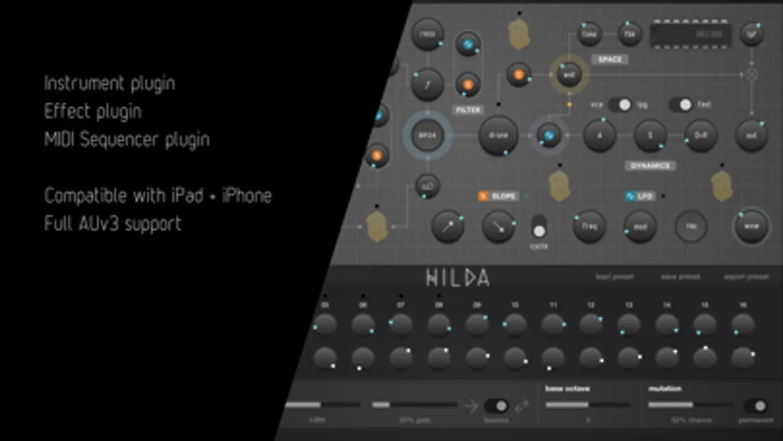 - Full Audio Unit compatibility (AUv3 instrument, audio effect and MIDI processor modes supported)