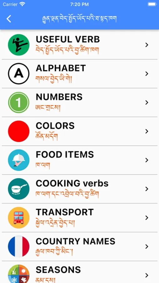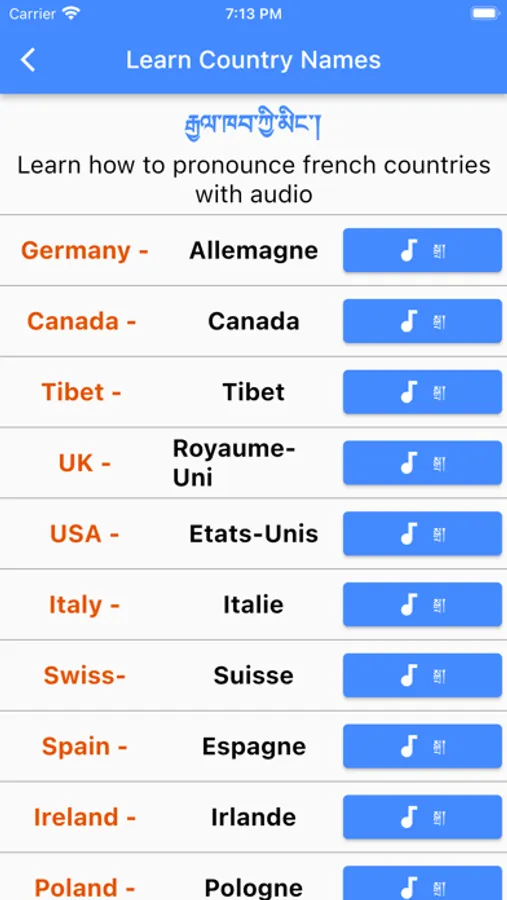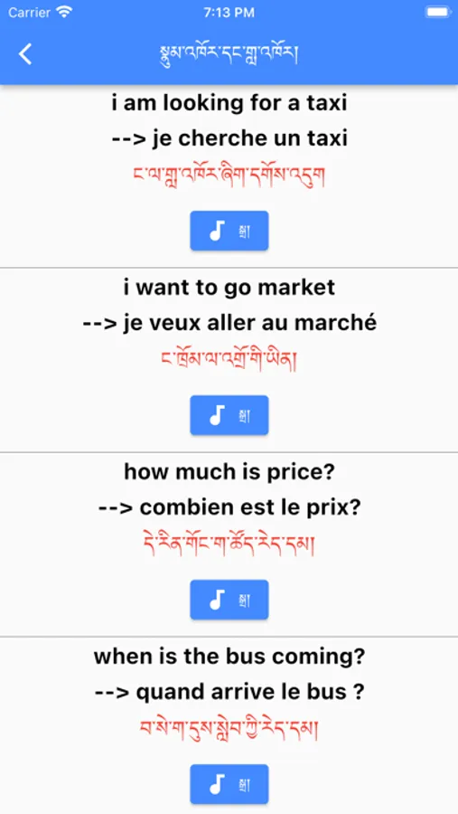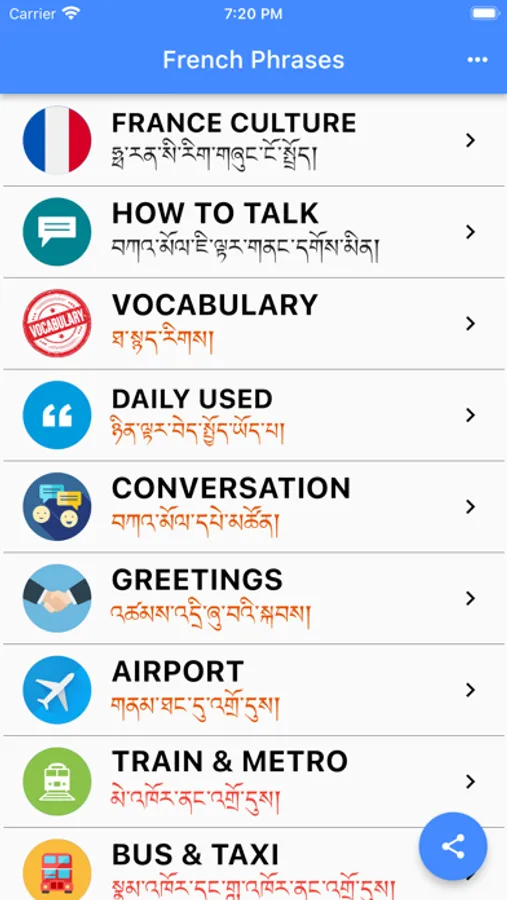 There are many tibetans in French speaking Countries where they struggle to speak in French language. Therefore I created this app which contains daily scenarios where we need to speak in French Language most of the time. It also contains vocabulary including alphabet, numbers, and other verbs which will definitely come in handy while communicatiing. The contents are as follows :