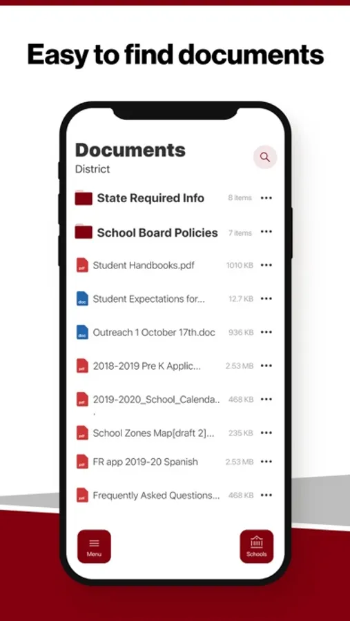 The event section shows a list of events throughout the district. Users can add an event to their calendar to share the event with friends and family with one tap.