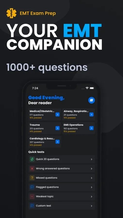 Introducing the ultimate EMT Prep App - your comprehensive tool for mastering the Emergency Medical Technician certification. With our premium features, you'll have access to 1000+ expertly crafted questions and detailed explanations covering all EMT exam topics, ensuring you're fully prepared come test day.