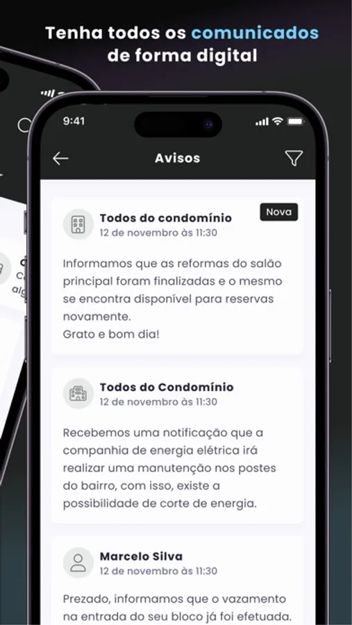 • AVISOS: Receba comunicados e notificações sobre o seu condomínio em tempo real.