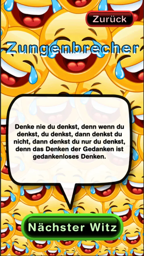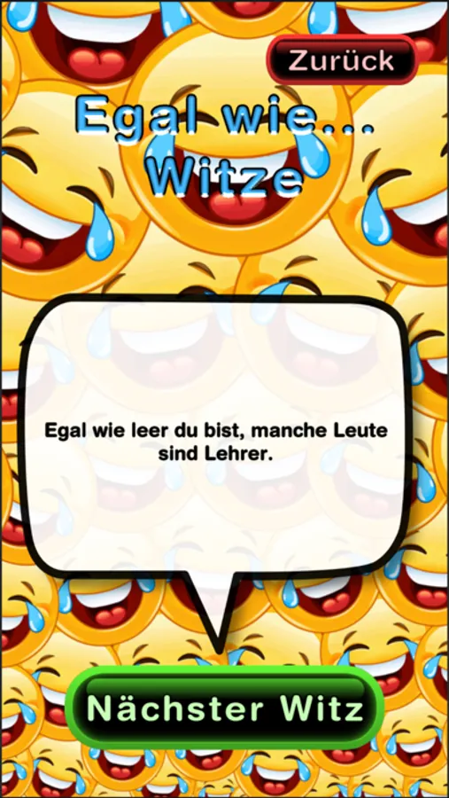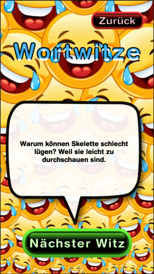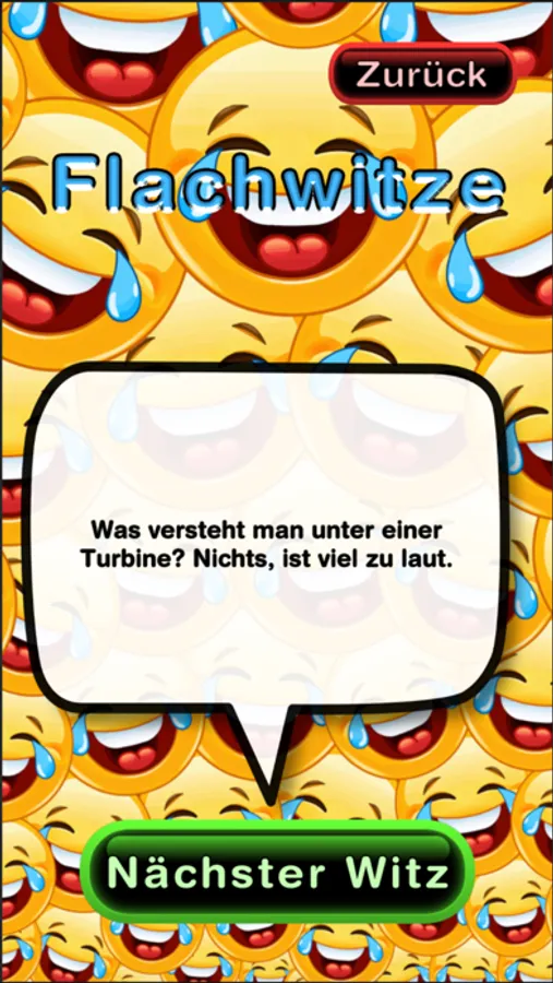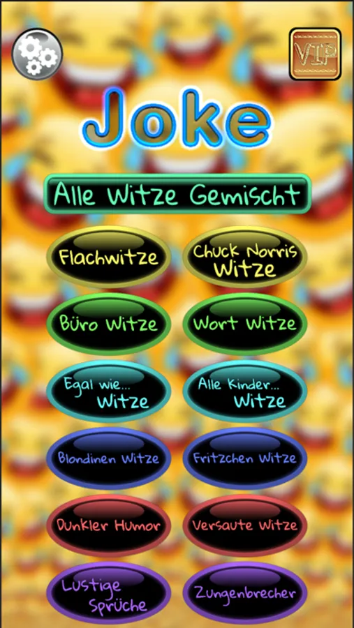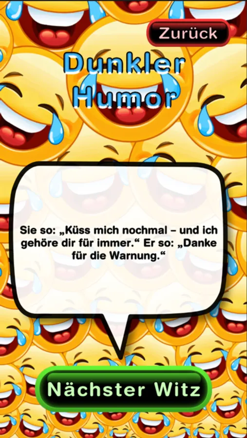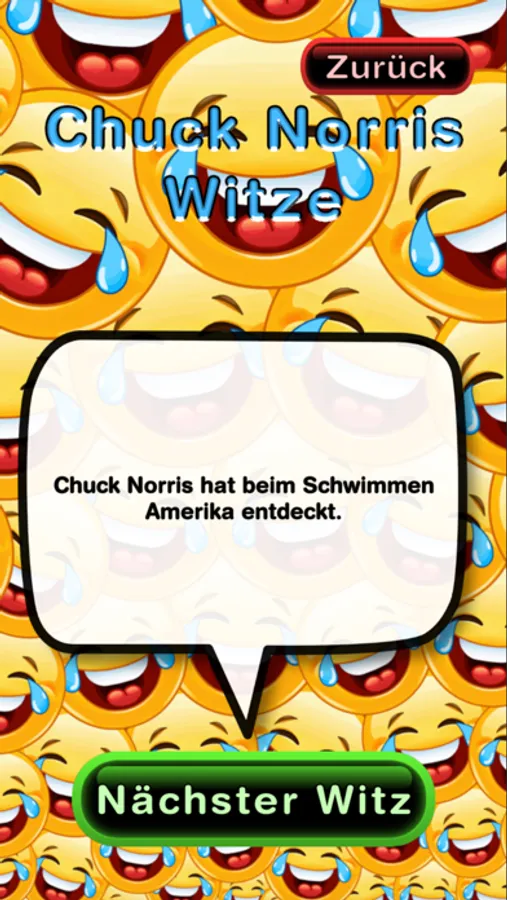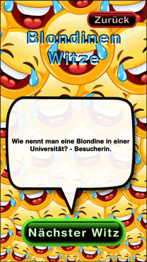 Neben Flachwitzen, Fritzchen Witze, Chuck Norris Witze, Wort Witze, Büro Witze, Blondinen Witze, Versaute Witze und Dunklem Humor findest du in der App insgesamt 12 Witzkategorien.