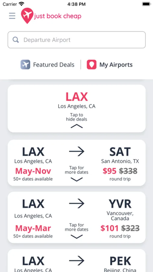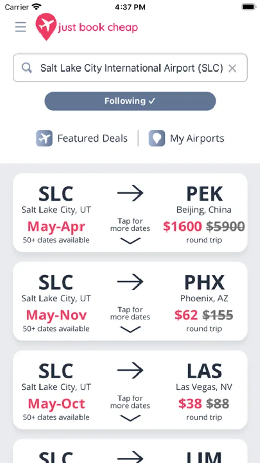 Introducing Just Book Cheap - the ultimate app for finding the cheapest flights! With Just Book Cheap, you can select your preferred airports and find amazing deals on flights departing from them. Our app works tirelessly to ensure that you always get the best possible price on your tickets, saving you hundreds of dollars in the process. Say goodbye to expensive travel and hello to Just Book Cheap!