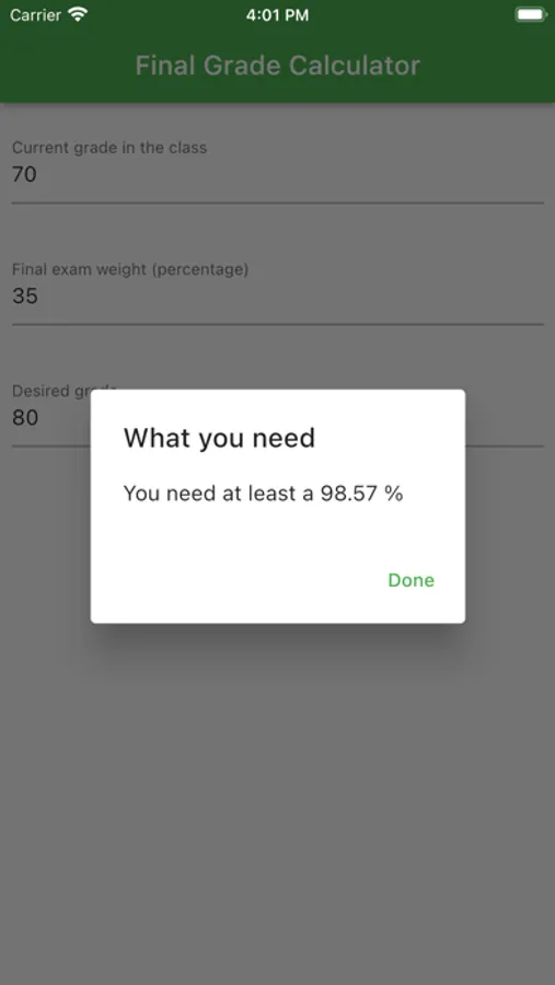 Enter the grade you have, the grade you want, and the weight of the final. Hit calculate and determine what grade you need on the final to get your desired grade in the class.