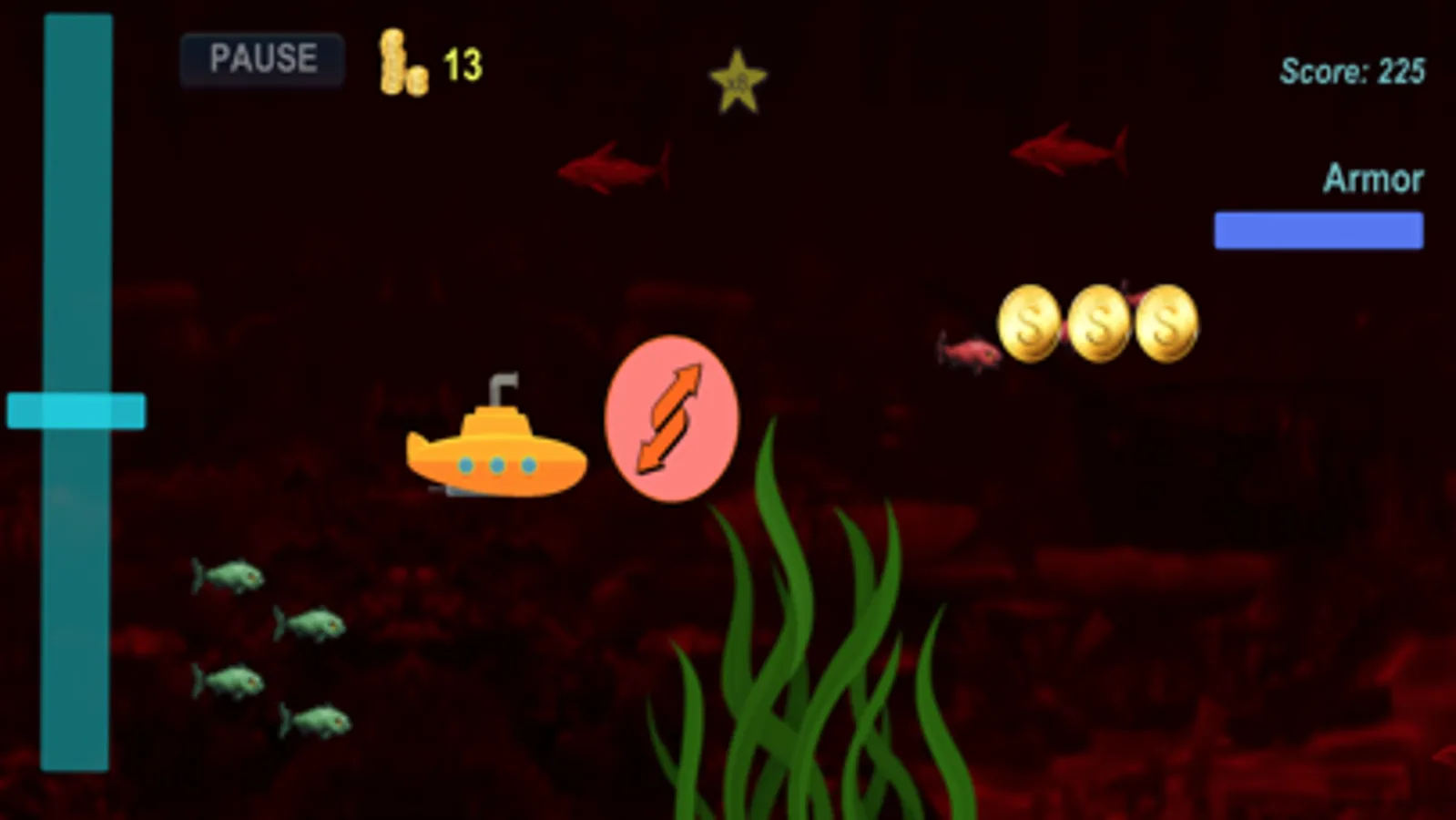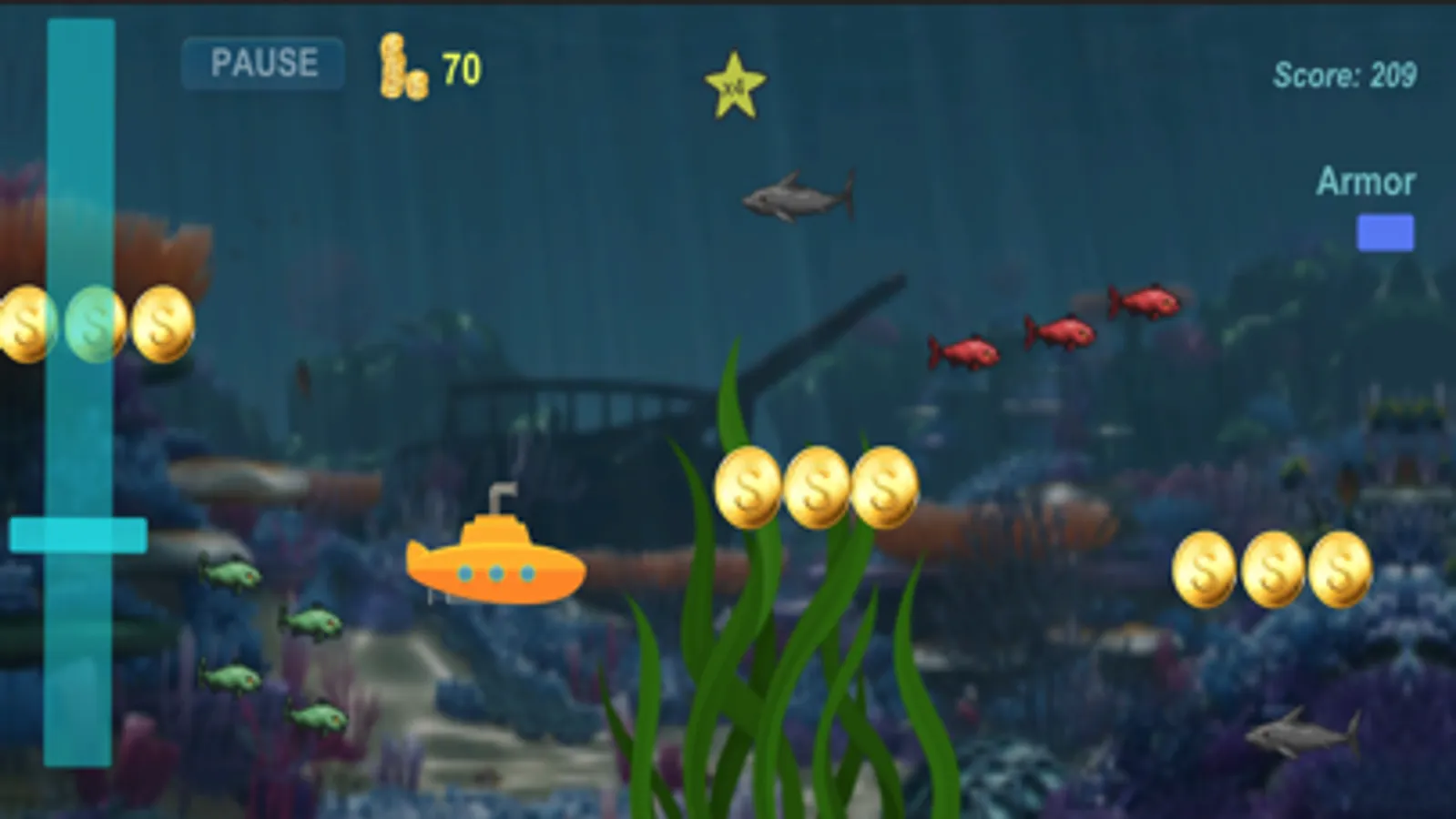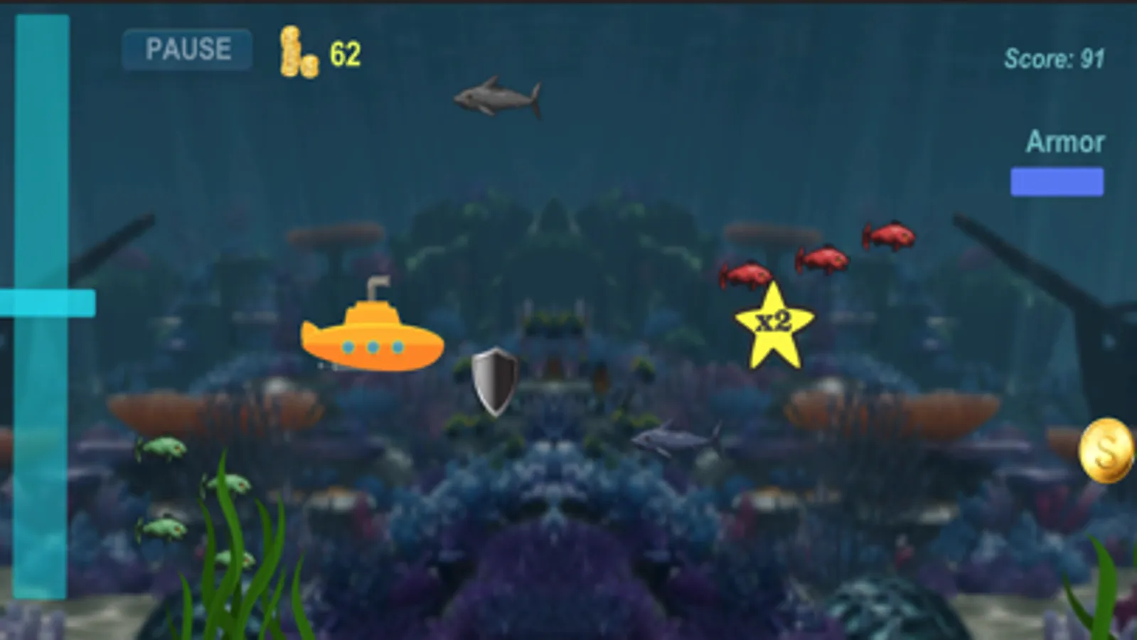 In this game, your goal is to use the submarine to swim as far as you can. You should collect items and coins which you will find in the sea. In shop you can use coins to buy new submarine. All of them have advantages.