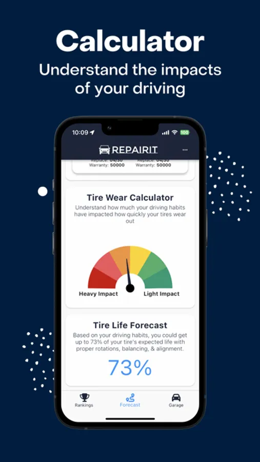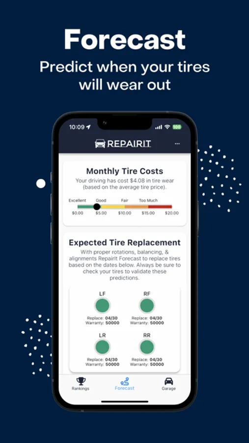 Step into the future of vehicle ownership with RepairIt, your intelligent companion that not only helps you with tire selection and maintenance but also offers predictive insights about tire wear and your vehicle's long-term health. RepairIt now focuses on its groundbreaking "Forecast" feature, providing you with an unprecedented understanding of your driving habits and their long-term impacts.