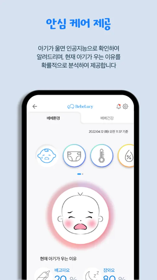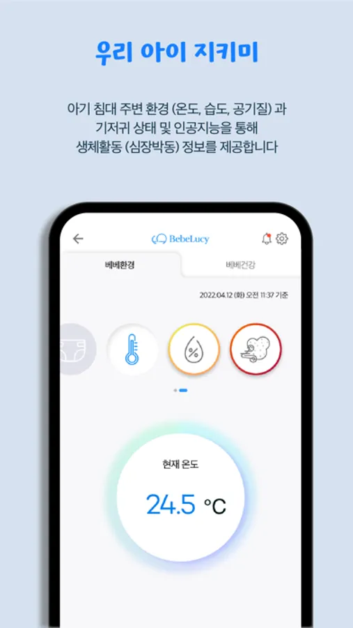 베베루시 앱은 인공지능 알고리즘을 기반으로 하여 아기의 실시간 건강 상태 모니터링과 스마트 아기 침대 제어를 목적으로 개발된 서비스입니다.
