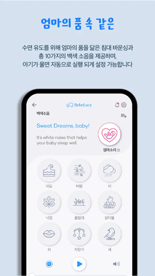 - 아기 침대 원격 제어 및 9가지의 백색소음 재생 가능
