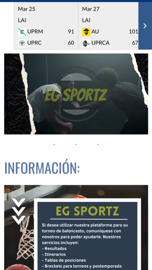 The EG Sportz app is created for the presentation of the results in the basketball leagues in Puerto Rico. We want to make it easy for all parents and fans to access games, scores, standings, and court directions. In it, the most updated results and position tables will be shared.