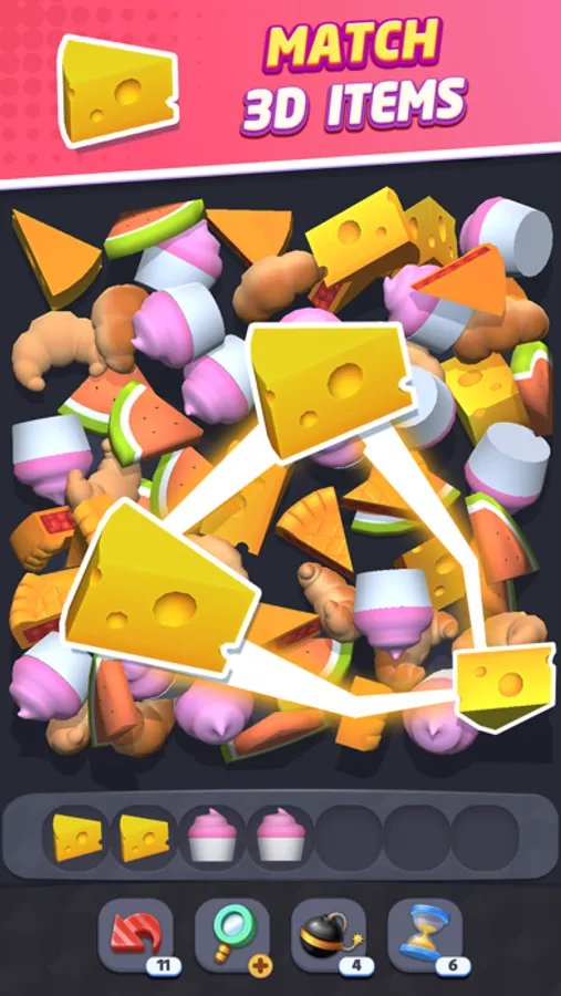 In this triple-match 3D game, you'll be matching objects on the ground and clearing them to get to the next level. As you progress through each puzzle level, endless new objects will be unlocked. This fun and relaxing time-killing puzzle game will not only improve your pattern-solving ability but is also easy to play!