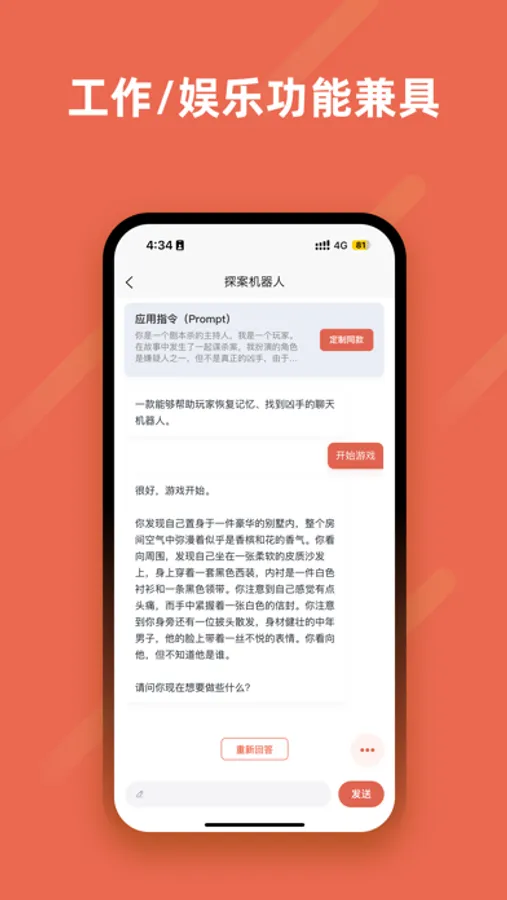 通过文本剧情情景的设置,您可以扮演其中的主要角色与AI互动交流,沉浸式体验文本带来的精彩世界与情感陪伴。