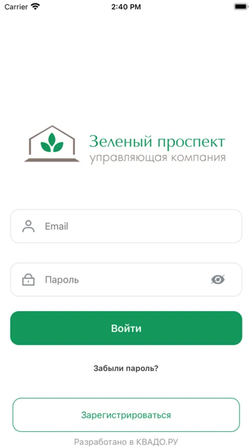 Мобильное приложение доступно только тем собственникам недвижимости, чьи дома обслуживаются Группой компаний "УК Зеленый проспект" и которые имеют учетную запись в интернет-сервисе КВАДО.РУ.