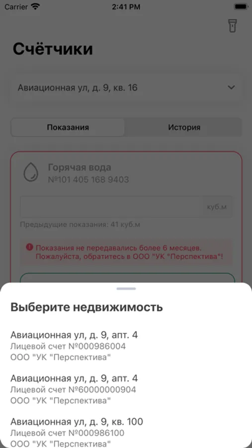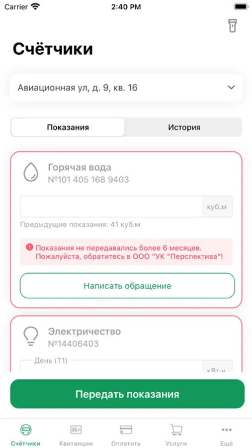 • Подача показаний счётчиков;