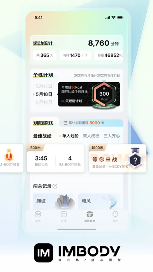 同步记录用户的课程训练、自由训练、个性计划、划船游戏的数据,协助用户科学管理训练,时刻掌握训练情况。