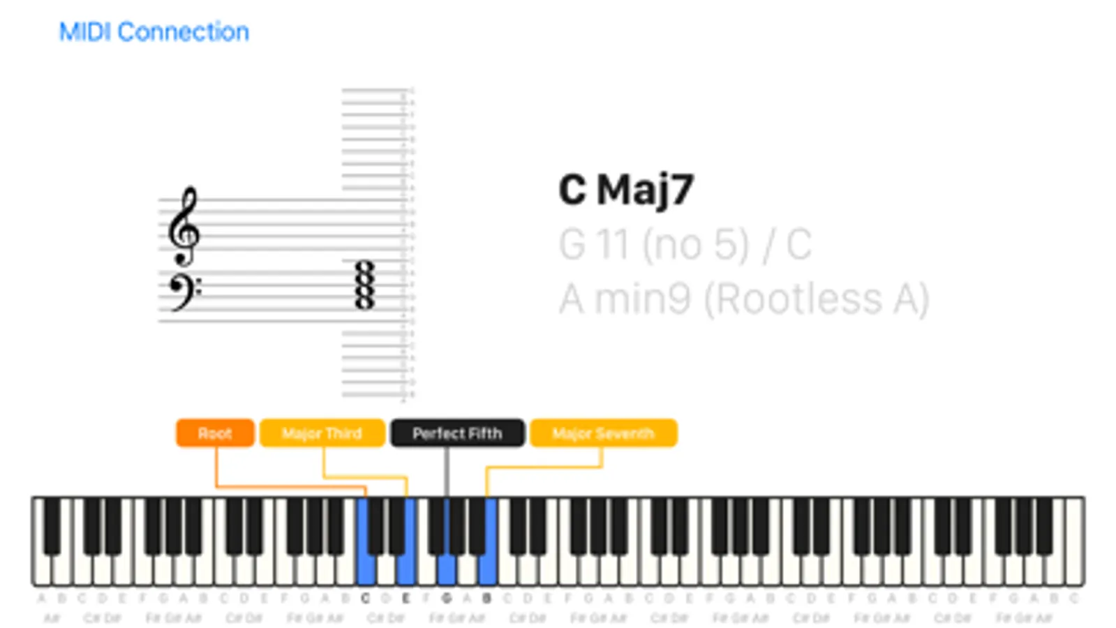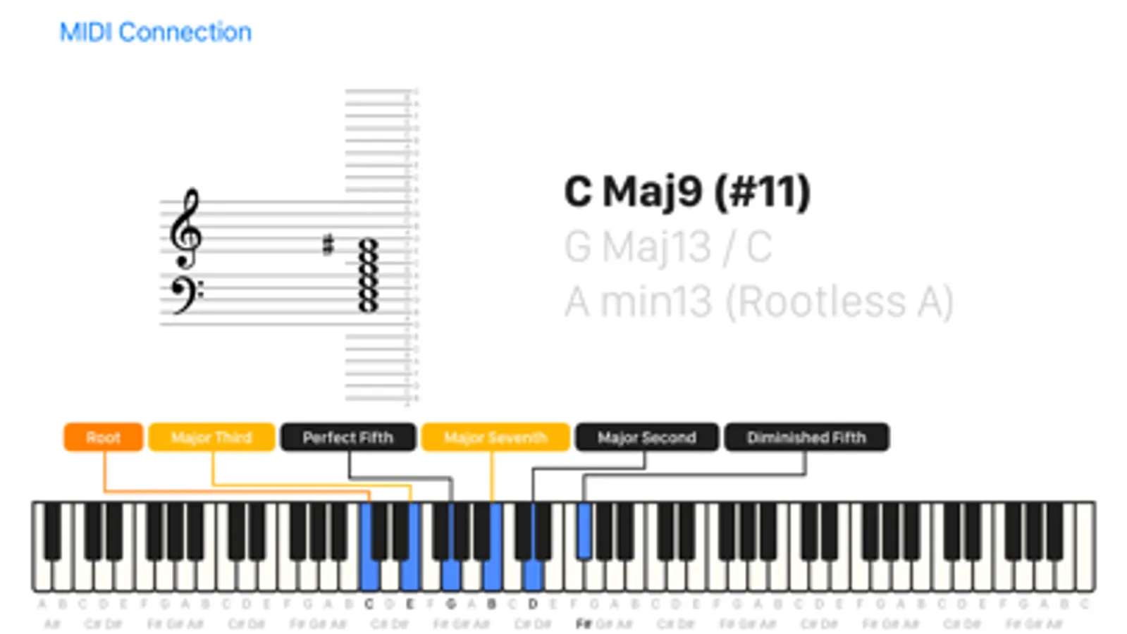 The notes are analyzed instantly and matching chords are displayed based on user preferences. The results show the set of possible chords with intervals the notes represent, relative to the root note. The analysis includes inversions and rootless voicings. All options are configurable to suit the intended purpose and use. Please note, this application does not play any sounds.