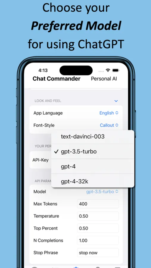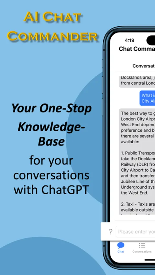 AI Chat Commander is your personal access to ChatGPT on your mobile device - your ChatBot powered by OpenAI´s Large Language Model. It is your personal assistant, ai writer, ai translator or chat companion that provides a seamless chatting experience with ChatGPT from anywhere, without requiring a browser and the typical security issues like cookies or tracking. Use the latest ChatGPT models provided by OpenAI, such as text-davinci-003, gpt-3.5-turbo, gpt4, and gpt-4-32k for increased creativity, productivity and safety.