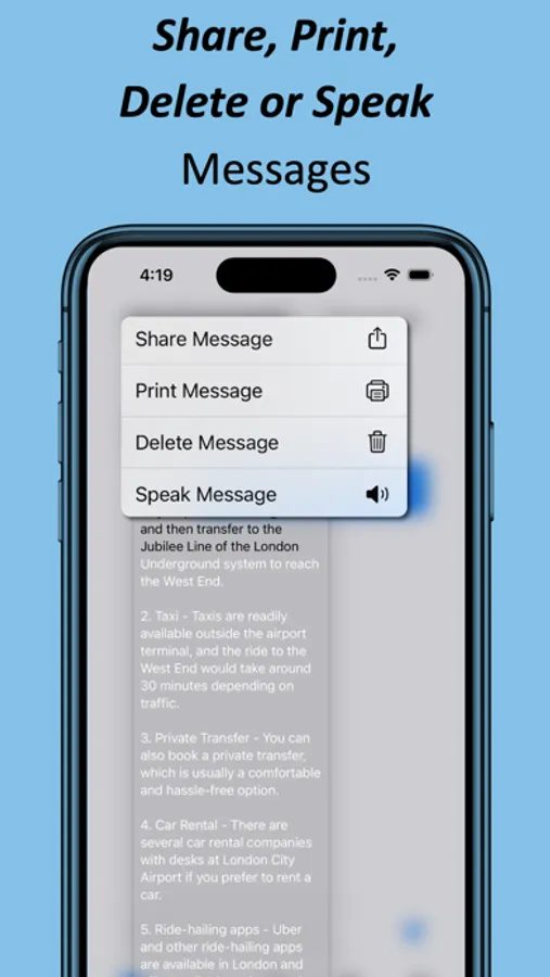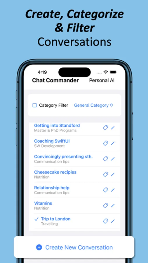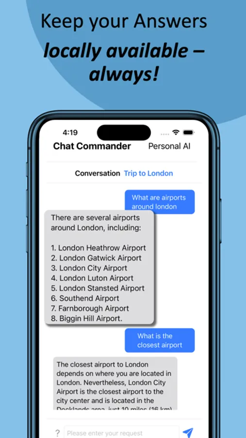 AI Chat Commander allows you to create an unlimited number of conversations and keep them local on your mobile device. Of course, you can print, copy or share any of your conversations. The important thing is: you have full control over it.