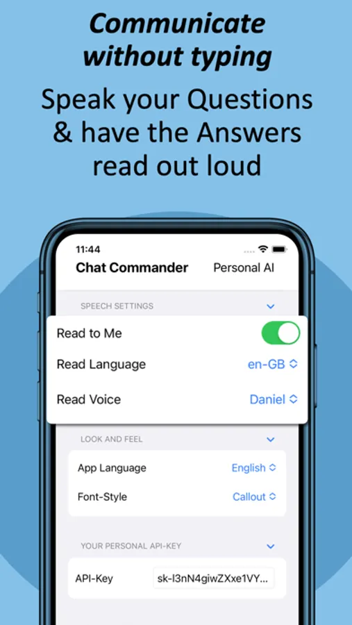 Use AI Chat Commander as your conversation partner! Conveniently dictate your queries using your voice and have complete answers read out loud either per message or generally with the "Read-to-me" option. You can select the desired country of origin and preferred voice for that.