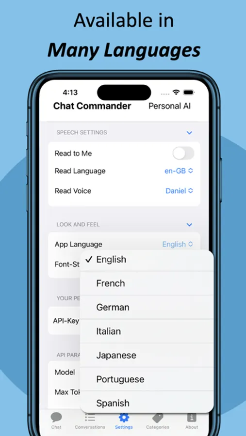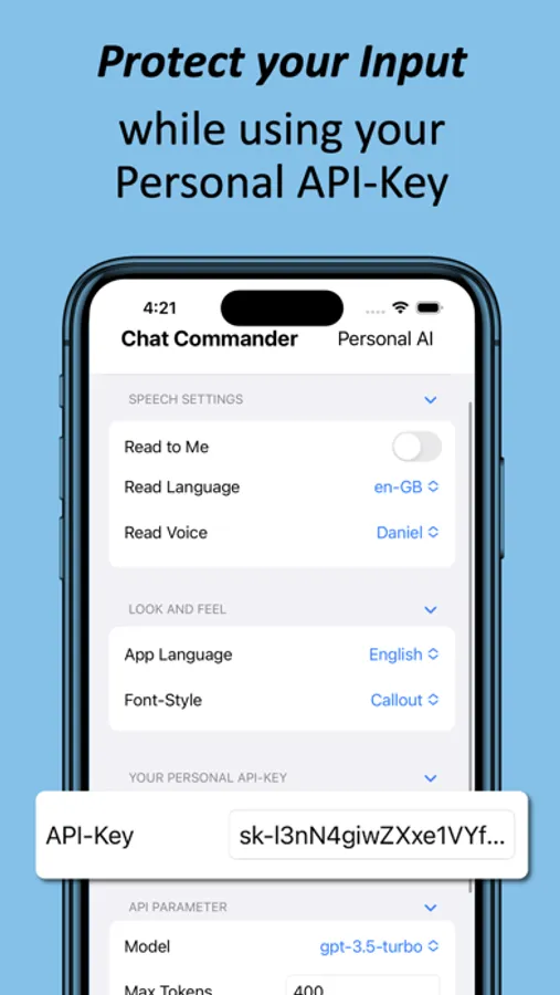 AI Chat Commander is powered by OpenAI's API for ChatGPT and needs a personal API-Key from OpenAI for usage. The app cannot function without this API-Key. Once you have entered your API-Key on the Settings Tab, you can access the full power of the app.