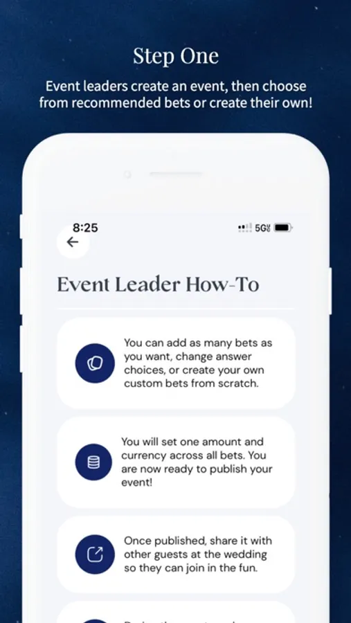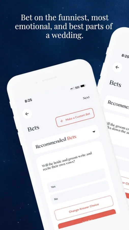 "Betting on the Wedding is the ultimate app to add some friendly competition and excitement to any wedding! With our app, you can create unforgettable memories by placing friendly wagers on everything from the vows to speeches, the first dance, and beyond.