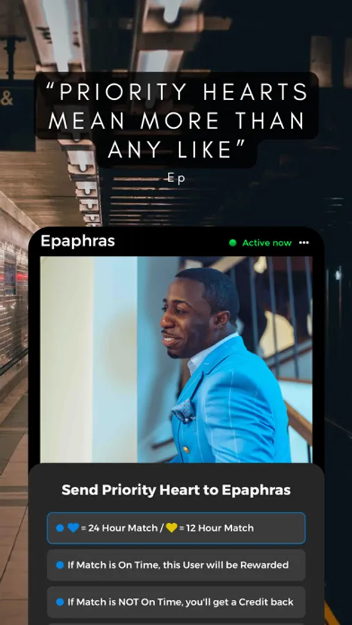 + Send Priority Hearts (Gold or Blue) to people you really like. People you send Priority Hearts to can be Rewarded for Matching On Time with you!