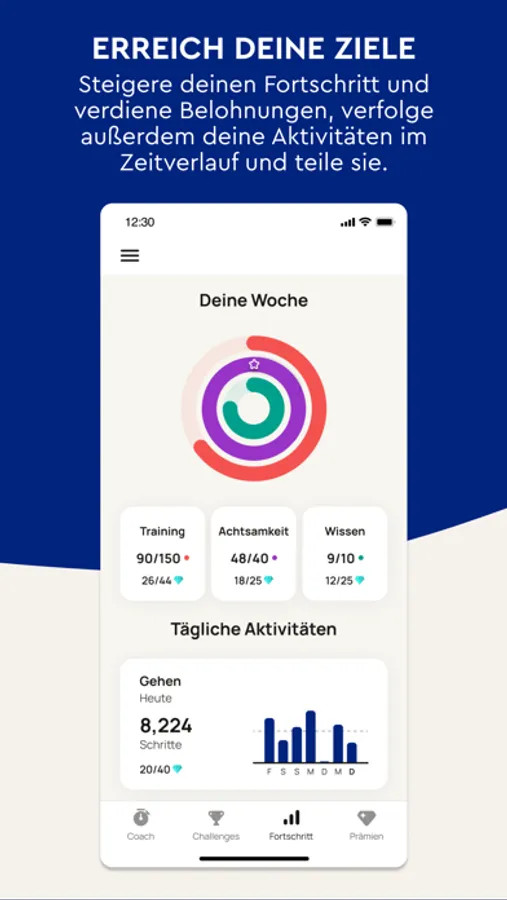Health Progress: Measure your progress in health-related activities, mental alertness & self-study. Use our Daily Coaching sessions or track your performance using your tracker or smartphone. Stay on track, measure your progress & get rewarded week after week.
