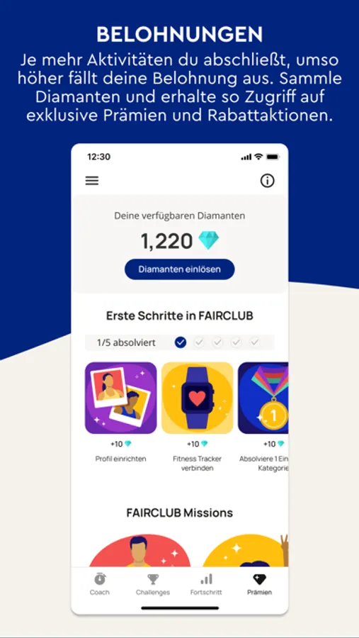 Rewards: The more activities you complete with FAIRCLUB, the more rewards you'll get. Earn diamonds for every activity: walking, jogging, exercising, cycling, learning or meditating. And by completing our missions, you'll receive even more diamonds! The new rewards program makes it easy for you to redeem diamonds & gives you access to exclusive discounts reserved exclusively for FAIRCLUB users.