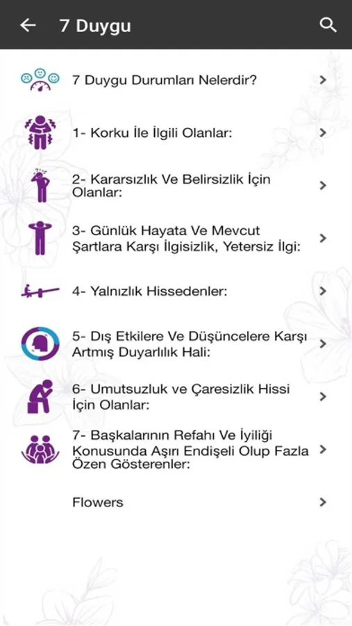 Bach çiçek terapisi, stres, endişe, korku, depresyon gibi birçok duygusal durumun tedavisinde etkili bir yöntemdir. Uygulama üzerinden kullanıcılar, bu duygusal durumları tanımlayarak kendilerine özgü çiçek özlerini seçebilirler. Ayrıca uygulama, çiçek özlerinin nasıl kullanılacağı ve hangi durumlarda etkili olduğu konusunda da detaylı bilgi sunar.
